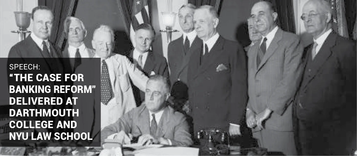 Delivered at Dartmouth College on June 11, 2013 and at NYU Law School on September 30, Mr Downey poses "The Case for Banking Reform" ...